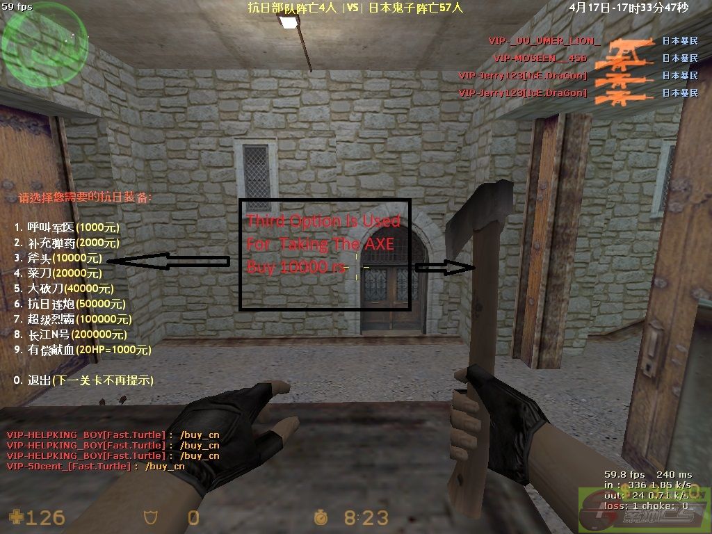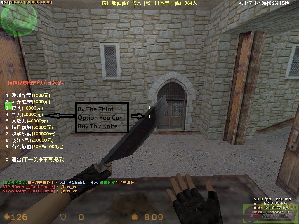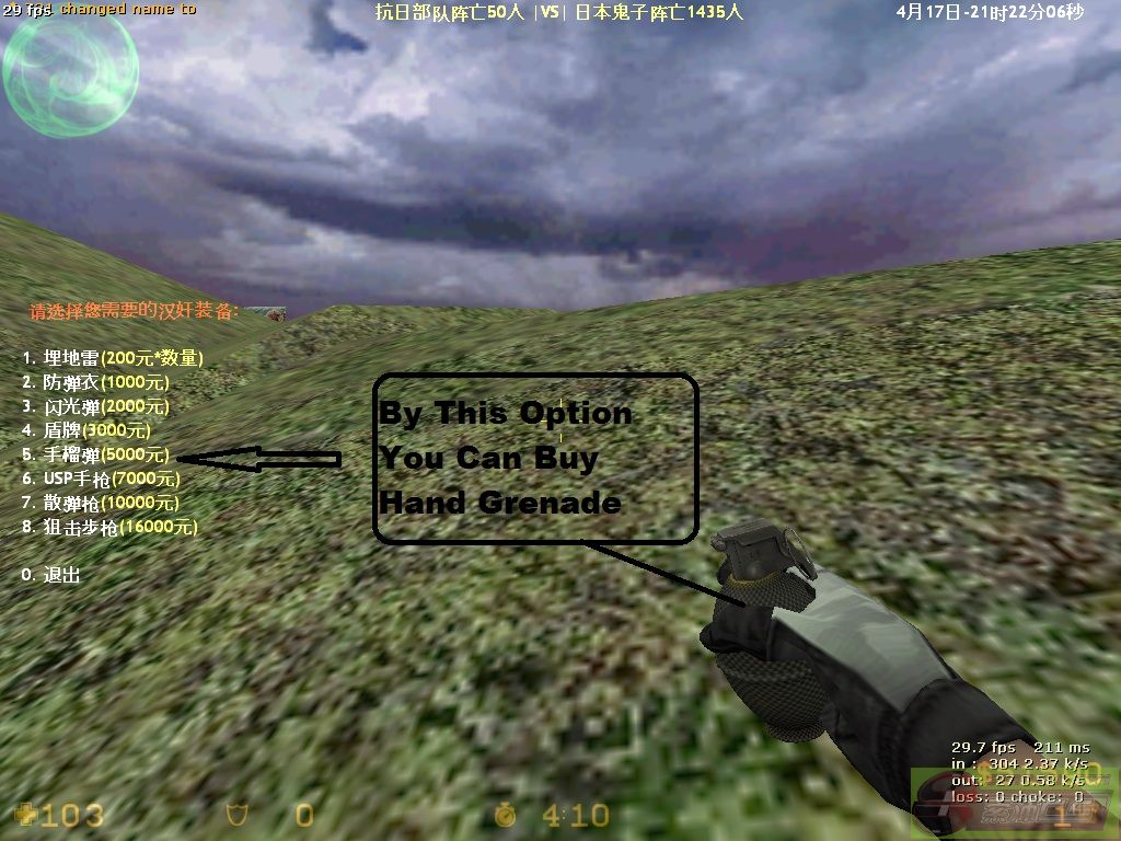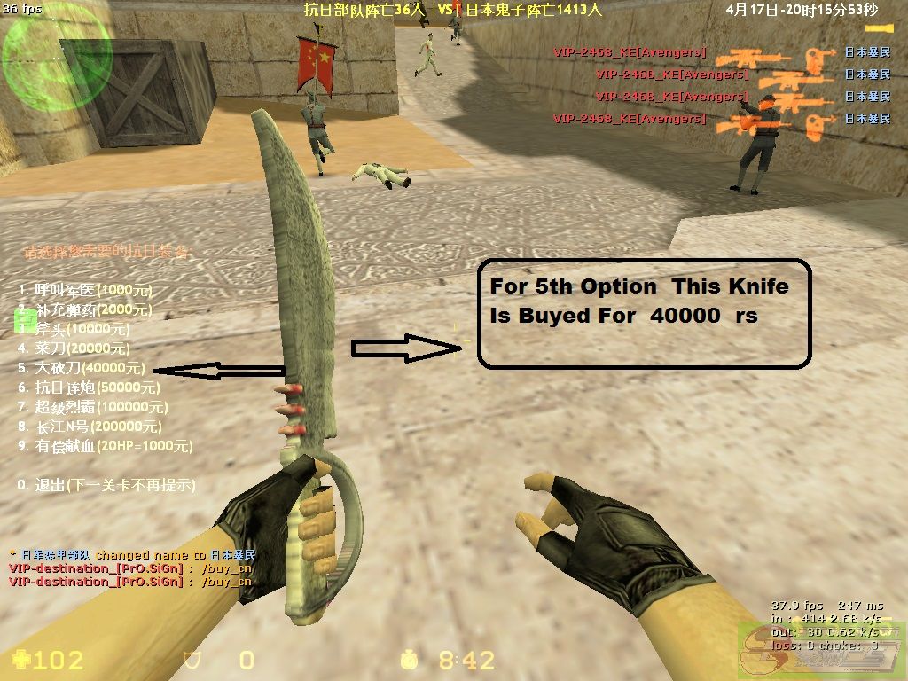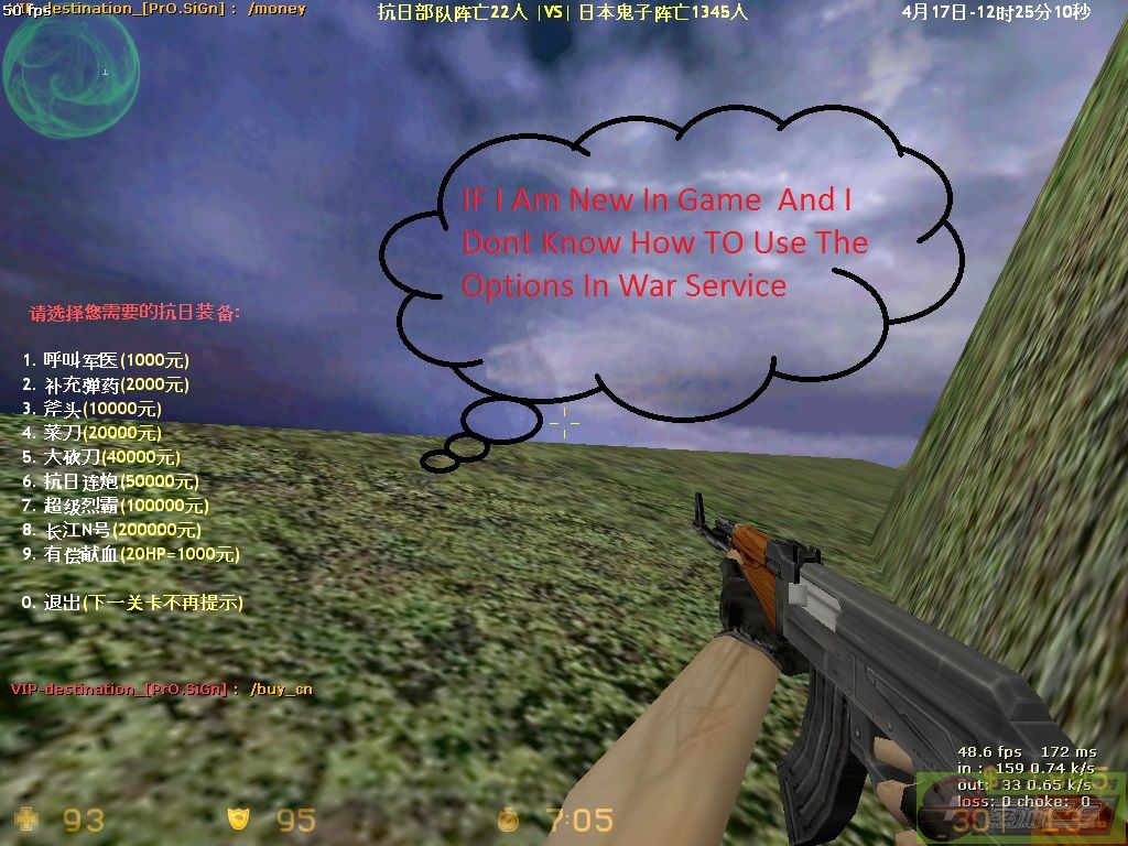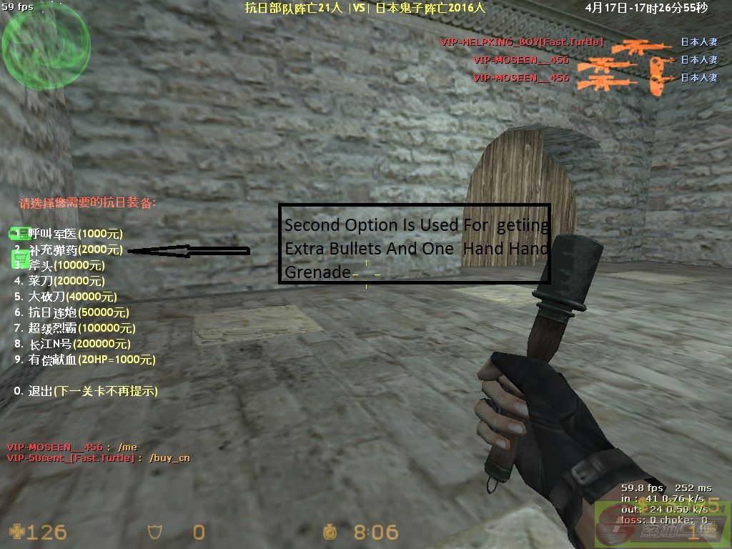 | -- 作者:50cent_ -- 发布时间:2013-04-18 17:53:00 -- **** War Service Tutorial **** ** War service Tutorial ** Because Of New Commers Are Seen More So They Are Unable TO Play War Service So Following To This I have Made A Post That May Help You For Playing War Service I Will Teach You The Options Used In The War Service Conditions In Which The Options Are Used :- The Options Are Used In Counter-terrorist Force And In terrorist First I Will Teach You The counter-terrorist Options :- In Terrorist we have to type say/buy_cn To Have All The Options as shown in figure Following It We Have All Options . Then there Will Be First Option The First Option Helps Us For Increasing Are Health In Case Are health Becomes Less Then Choose This Option In Rs 1000 thousand and Increase Your 10 Health As Shown In Figure The Second Option Is Used For Buying Extra Bullets And One Hand Grenade In Rs 2000 thousand As Show In Figure The Third Option Is Used For Taking A Axe For RS 10000 thousand Throw Which You Can Kill Counter-terrorist bots The Fourth Option Is Used For Taking A Knife For Rs 20000 thousand This Also Help TO kill Counter-terrorist Bots By The Fifth Option You Can Buy big Knife With More Damage For Rs 40000 thousand Which Will Help You To Make More Score By The Sixth Option You Can Buy balck shot Gun For More score For Rs 50000 thousand AS Shown In Figuer The seventh option is used for buying a golden machine gun for Rs 100000 lakh It help to make more score in less time The Eight option is used for buying the golden scout gun which is popular gun and every one like this gun in rs 200000 lakh And The Ninth Option Is Used to Sell Your Health And Earn Money By Selling 20 health You Can Earn Rs1000 Thousand But You Can Sell The Health Till 30 Health Only (20 hp=1000 rs) If You Don’t Want To Buy Any Thing Then press 0 TO Quit The Options [此贴子已经被作者于2013-4-19 23:21:07编辑过]