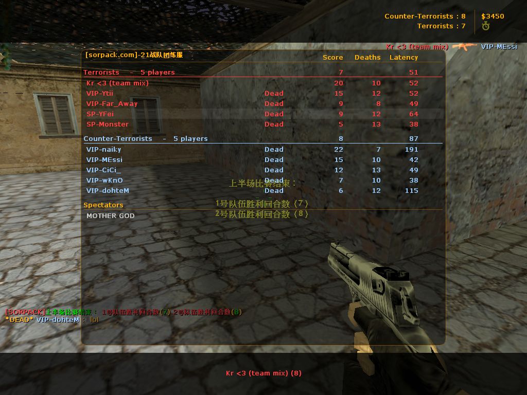 再補充一下評論 - 當CT時,camp點太單調。多用AB點的箱子,是我的建議 - 大家當T/CT實在太太太太喜歡走動+鬥槍了,尤其是當CT很少主動出去的,記著任何地圖當CT,第一是守,守不到就退,寧願讓人裝c4,都要等隊友回防。你一個鬥槍只能拖個幾秒,搞不好還給人家殺了。(幾位經常在窗口現身的CT事注意啦) - 當T很多次,扔完o3o4o5又不衝,幹嘛。要知道一鼓作氣,再而衰,三而歇,結果真正衝的時候,一個o3o4o5也沒有,給人殺了後悔也不及 - T/CT都很少穿牆。多看教學,多看demo,大約知道一下inf, d2, train, nuke的穿點,不但可以穿死人,也可以避免自己給人穿死。今天我就穿死了dothem一次。 - 當T時,簡單點說,就是無合作過,叫佯攻變真攻……看來我要找回電腦的保用證去修理咪了……