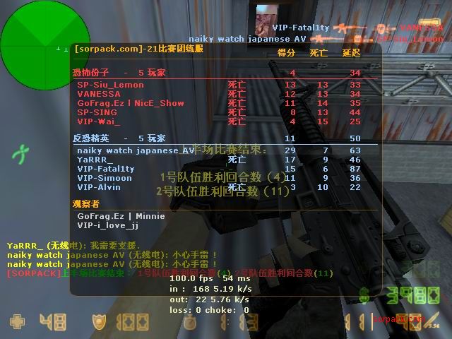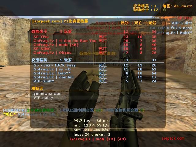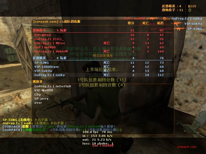 杀了56:8 我还没杀完呢 结果被一帮人投票了。。 看左下角。。投票正在火热举行,我赶紧按住TAB 截一张图。。。 这图应该还在GOF个人战绩榜里 ~ 战胜肥肥的队。 GOFvsXXX 有人说我不会打 “|”。。。 俺是故意打“/”的。。。