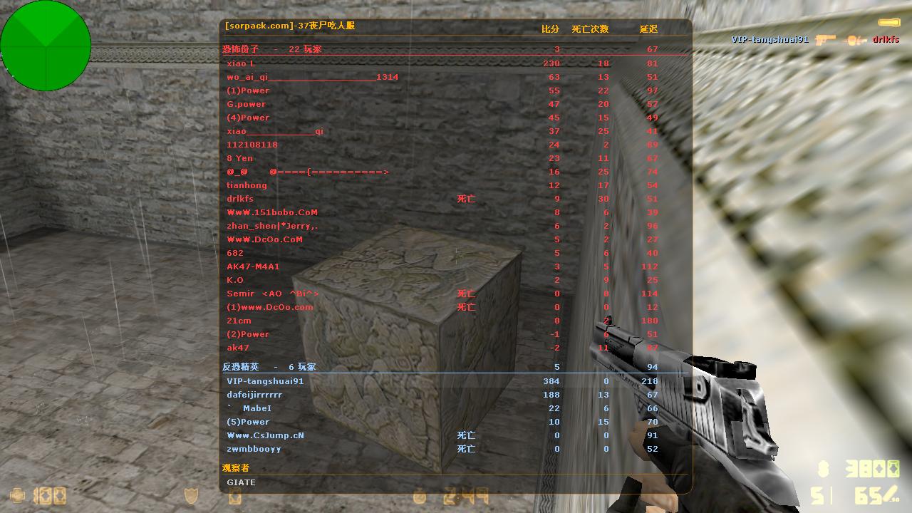 | -- 作者:tangshuai91 -- 发布时间:2009-02-01 20:13:00 -- [灌水]不是一般的郁闷!!! 居然一局被T了2次,我的郁闷,第二局还好有拷图,还有5分钟才换图又被T了,好说也是个人的最新最高处女作啊。 |