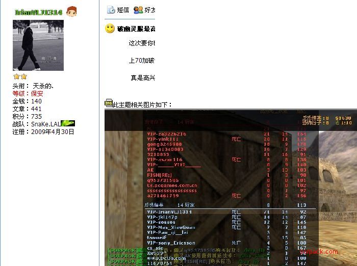 | -- 作者:wlp -- 发布时间:2009-07-16 11:50:00 -- [原创]我们落后了 纪录被蛇族破了 我们队好像没有多少人玩幽灵服了 大多数人都在玩奔跑服或别的服 希望我们队多多加油 破了蛇族的纪录 |