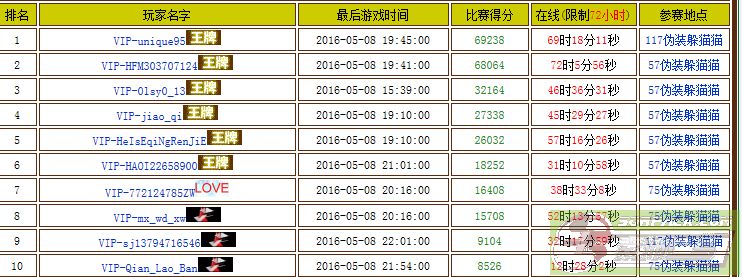 排名 玩家名字 最后游戏时间 比赛得分 在线(限制72小时) 参赛地点