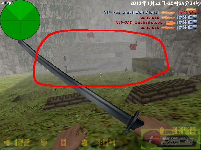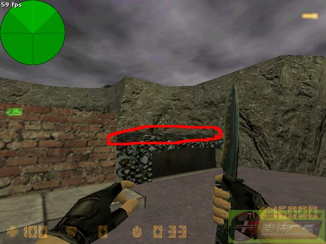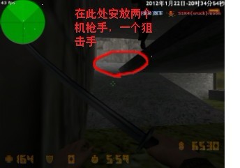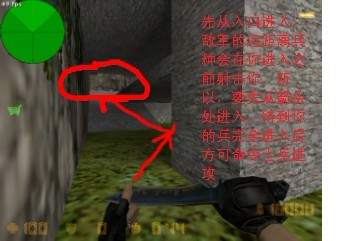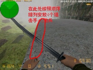 画圆圈的位置可以放几个炮兵和狙击手,在这个地方敌军的民兵都上不来,不过,你要把你的兵都拉后点,敌军有时砍得到的.至于下面的洞口,不推荐放置兵种,一来敌军有时砍得到,二来射击口太小,放炮兵的话会炸到洞口,其他兵种的子弹也会乱飘.
