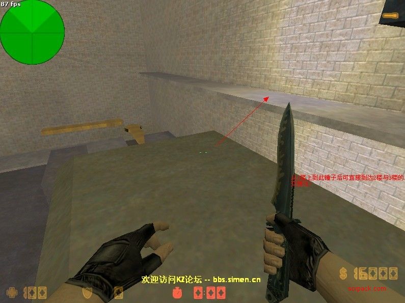 当CT到达锤子顶部 如图所示 可从锤子跳往箭头指处 直接到了上3楼的地方.3楼机关仅仅4个.况且如果T看不到的情况下.1分钟内CT WIN.