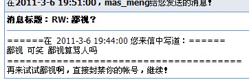 短信而且还说:试试鄙视啊,直接封禁你的帐号。 是谁封帐号? 自己慢慢想把 想你这样 投诉区版主你肯定 会被撤的 放心把