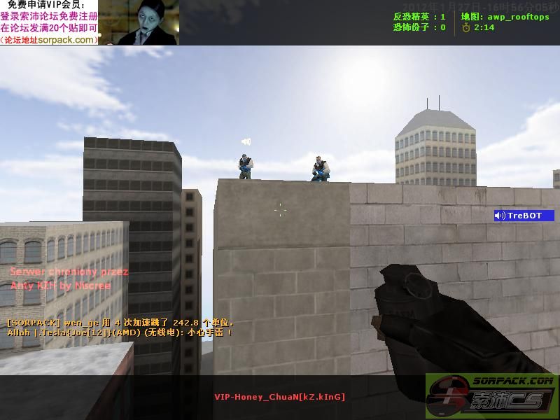 录制者:SbSp 嫌疑人:VIP-Honey_ChuaN[kZ.kInG] 时间:2012年01月27日 16:55:43 服务器:[sorpack.com]-84抓人躲猫猫(kZ.kInG) 地图:awp_rooftops