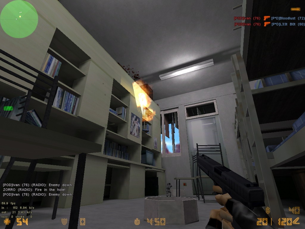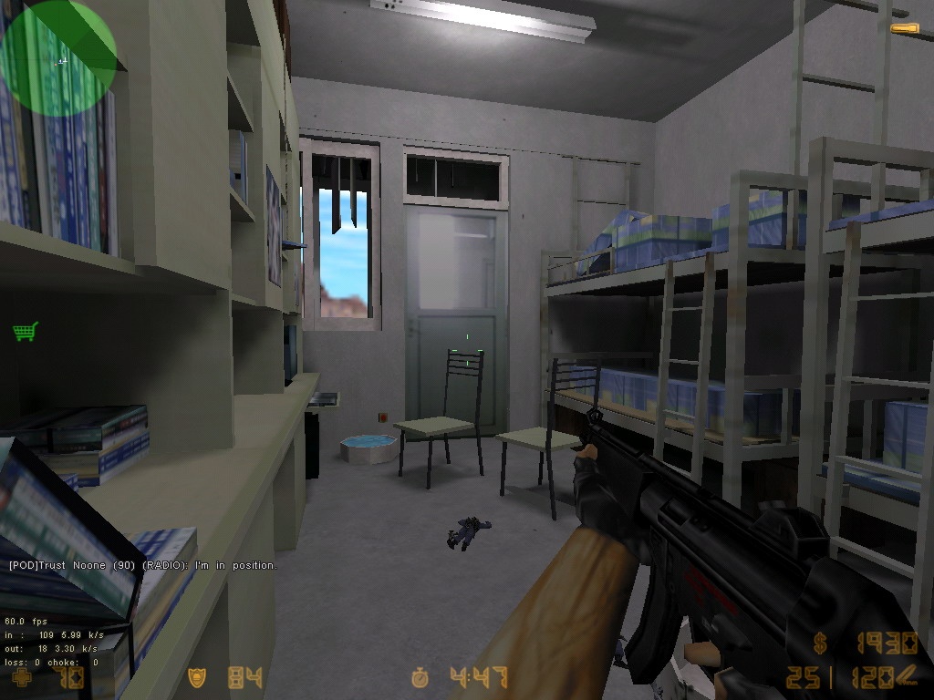 | -- 作者:saloman -- 发布时间:2008-06-22 13:37:00 -- 大学宿舍地图 比较小,4 vs 4的炸弹地形(埋雷点在某张床上),但是结构复杂,有不少暗道,机关 找到cs安装文件夹(如“E:\\游戏\\CS1.5中文硬盘版\\”) 把530.wad装在 把530.bsp装在 把qiaomen.wav装在 530.pxp和530.pwf是机器人程序,如果想和电脑人打的话就把它们装在