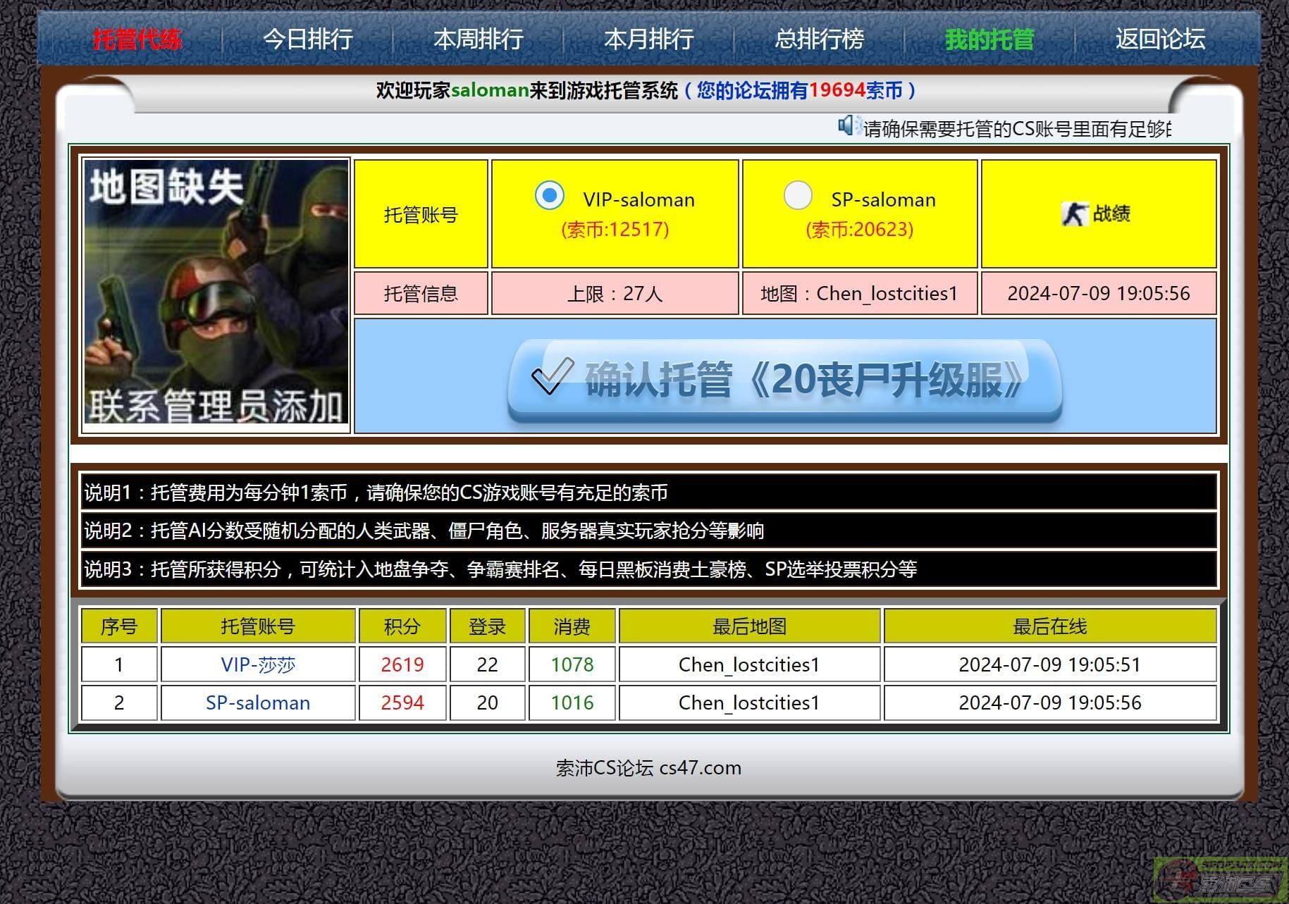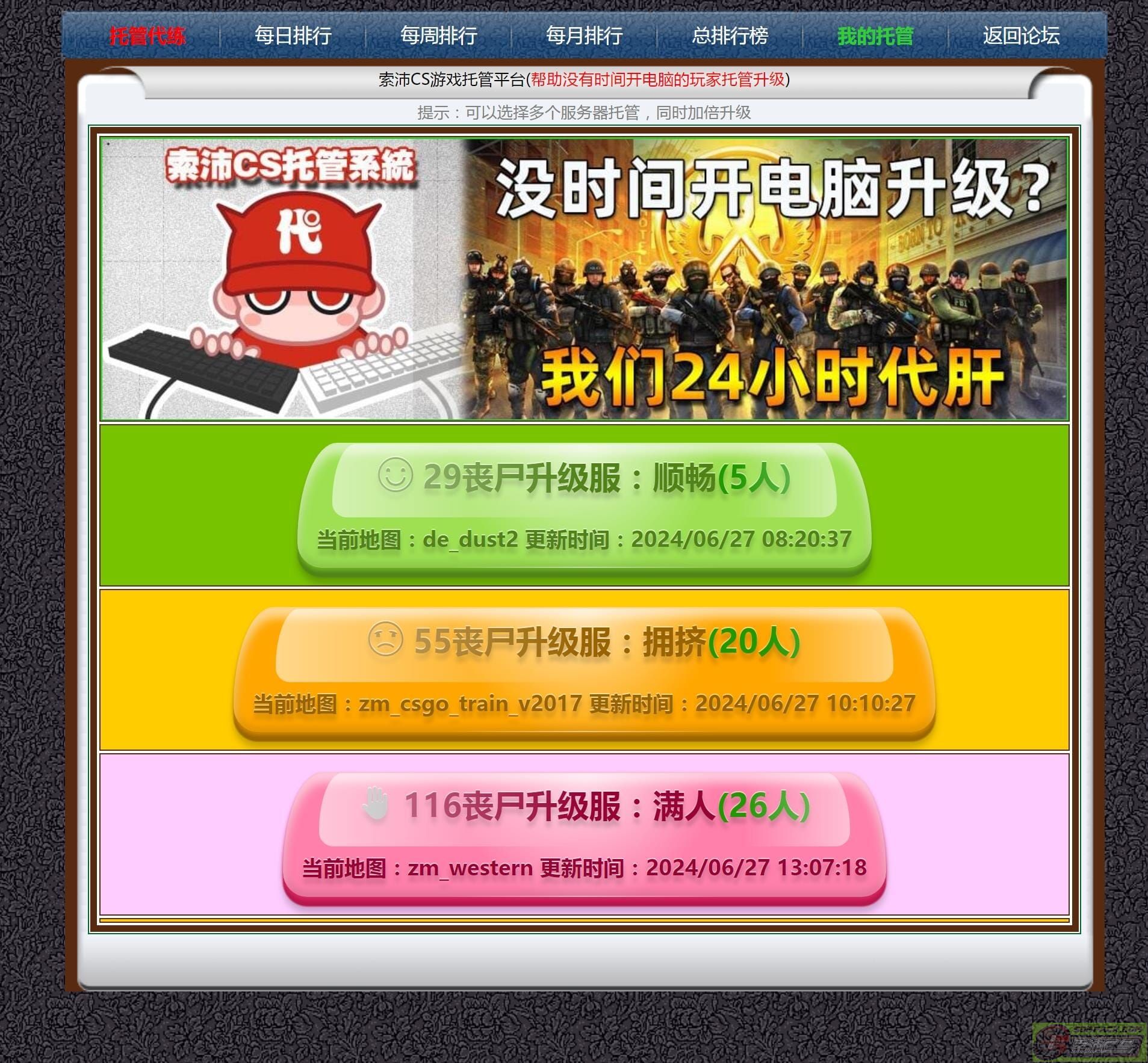 | -- 作者:澜 -- 发布时间:2024-07-09 19:29:00 -- 以下是引用saloman在2024-07-09 19:21:00的发言: 有时候晚上很困了,但是为了升级一直还在熬夜,年轻的时候还可以,年级大了就顶不住了。 加上现在使用电脑的人越来越少了,即使家里有电脑,也很少开机。 现在索沛有托管系统了,当你没空或者累的时候,就可以随时开启,让你的账号一直在线升级。 同时也避免了,有些人把账号密码给别人帮忙升级,导致被盗或开挂作弊等纠纷。 AI系统接入升级,会受到很多种影响,分数肯定比真实玩家要少很多。 例如随机分配的人类武器、僵尸角色、服务器真实玩家抢分等影响,所以分数多少看运气! 托管所获得积分,可统计入地盘争夺、争霸赛排名、每日黑板消费土豪榜、SP选举投票积分等 功能刚刚推出,具体玩法请大家自己摸索,有bug请反馈,有奖励! 访问地址:http://sk00.com/new_plus/tg/ (也可以从个人战绩那里点击进去) 此主题相关图片如下:![]() 此主题相关图片如下:![]() 此主题相关图片如下:![]() 此主题相关图片如下:![]() 另外大量招聘技术人才,为索沛CS添砖加瓦,工作地点深圳宝安区 要求会制作模型、熟悉cs插件、c++编程等。 此主题相关图片如下:![]() 能不能赶紧更新一下技能以及武器 现在对索沛都快丧失兴趣了