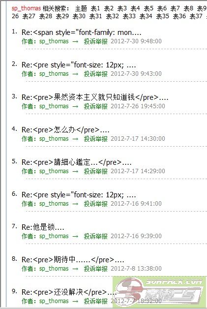 http://sorpack.com/dispbbs.asp?boardID=39&ID=1321720&page=1抓到一个恶意复制别人语言灌水的,,版主请注意看4楼这个人全是复制别人发过的语言回复灌水。。有过犯罪记录前科版主封禁他7天到15天[等待处理upload=jpg]UploadFile/2012-7/201273010151111957.jpg[/upload]