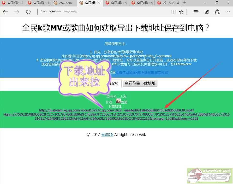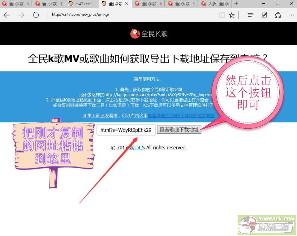 教程第二步:打开索沛全民K歌下载地址获取页面,把刚才的听歌地址粘帖到这里,并且点击查看歌曲下载地址按钮。