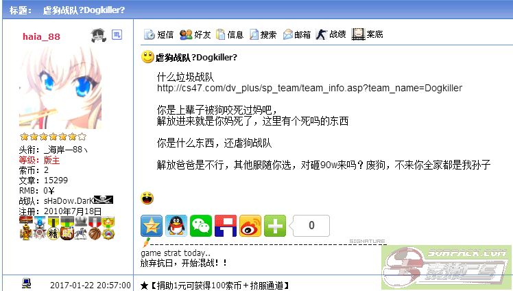呵呵,这个haia_88,昨天在解放被我们队长虐了,然后打不过就开始喷粪骂人,现在又到论坛来反咬,呵呵,真厉害呀