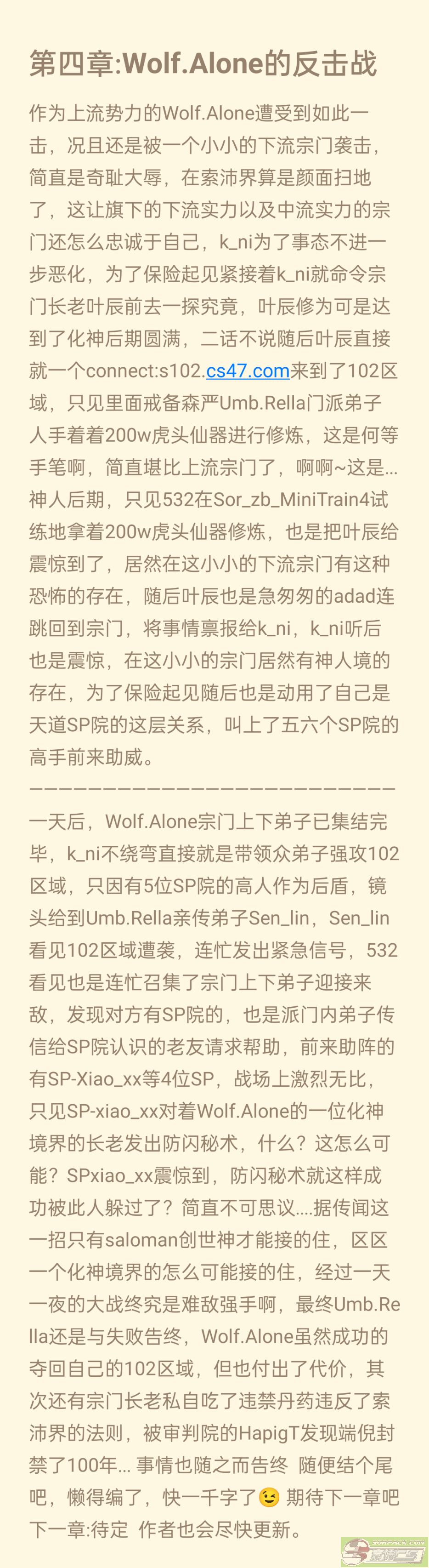 一天后,Wolf.Alone宗门上下***已集结完毕,k_ni不绕弯直接就是带领众***强攻102区域,只因有5位SP院的高人作为后盾,镜头给到Umb.Rella亲传***Sen_lin,Sen_lin看见102区域遭袭,连忙发出紧急信号,532看见也是连忙召集了宗门上下***迎接来敌,发现对方有SP院的,也是派门内***传信给SP院认识的老友请求帮助,前来助阵的有SP-Xiao_xx等4位SP,战场上激烈无比,只见SP-xiao_xx对着Wolf.Alone的一位化神境界的长老发出防闪秘术,什么?这怎么可能?SPxiao_xx震惊到,防闪秘术就这样成功被此人躲过了?简直不可思议....据传闻这一招只有saloman创世神才能接的住,区区一个化神境界的怎么可能接的住,经过一天一夜的大战终究是难敌强手啊,最终Umb.Re lla还是与失败告终,Wolf.Alone虽然成功的夺回自己的102区域,但也付出了代价,其次还有宗门长老私自吃了违禁丹药违反了索沛界的法则,被审判院的HapigT发现端倪封禁了100年... 事情也随之而告终 随便结个尾吧,懒得编了,快一千字了😉 期待下一章吧
