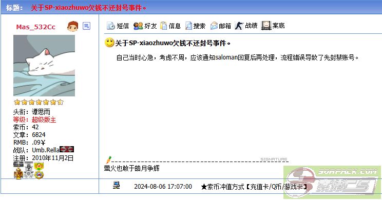 退一万步来讲,他欠钱不还,就该封,也别说我滥用职权什么的,况且,sp事saloman 才能锁的,微信上也和saloman 说了,过程错了,也发帖了,个性签名就别说了,今天抖音看到的一句话就换上了,别代入就好。