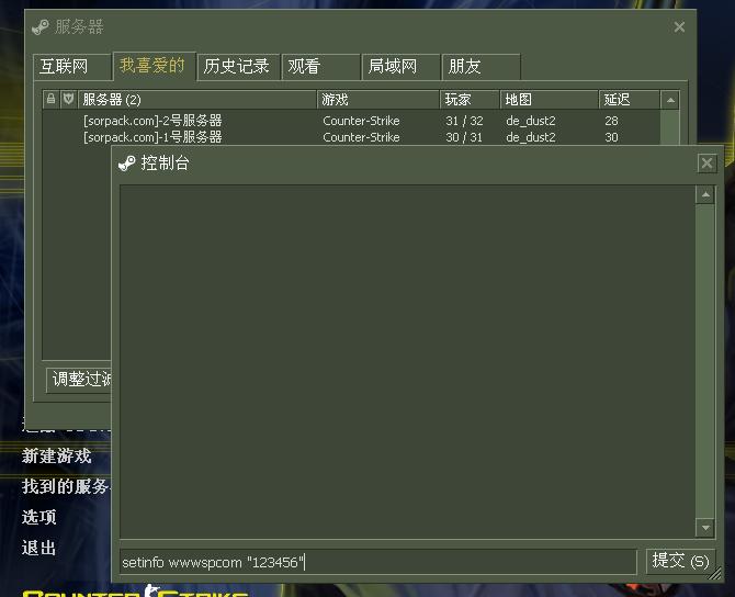 如果上面方法1未能成功,那么你可以尝试方法2:在没有进入服务器之前,调出控制台(键盘的~键,数字1前面那个按键),输入setinfo wwwspcom "123456" (这里的密码123456是我随便给大家演示看的,你们要记得改成自己设置的密码