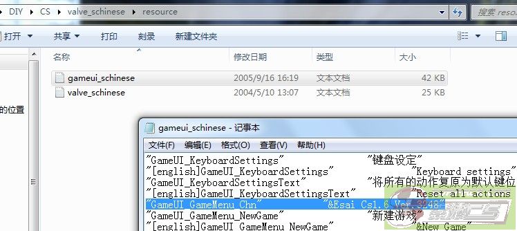 首先是2张txt,gameui_schinese.txt和valve\cstrike_schinese,看英文部分大家也该明白,gameui是什么意思客户端UI的字典,第二张是这个MOD
