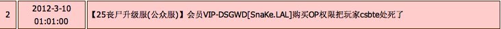 | 48 | 2012-3-10 01:01:00 | 【25丧尸升级服(公众服)】会员VIP-DSGWD[SnaKe.LAL]购买OP权限把玩家csbte处死了 |