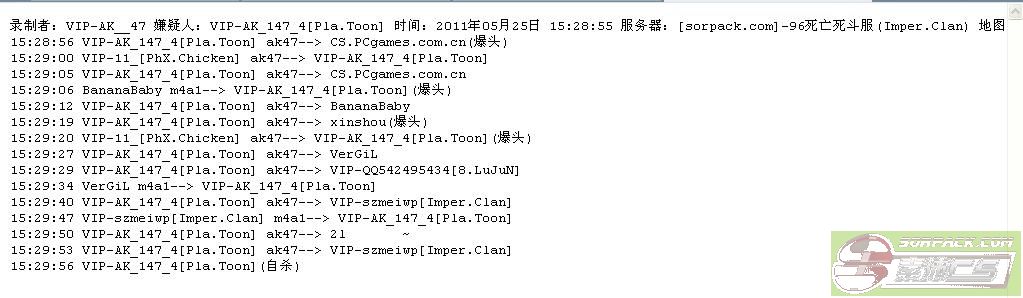 录制者:VIP-AK__47 嫌疑人:VIP-AK_147_4[Pla.Toon] 时间:2011年05月25日 15:28:55 服务器:[sorpack.com]-96死亡死斗服(Imper.Clan) 地图:cs_italy 15:28:56 VIP-AK_147_4[Pla.Toon] ak47--> CS.PCgames.com.cn(爆头) 15:29:00 VIP-11_[PhX.Chicken] ak47--> VIP-AK_147_4[Pla.Toon] 15:29:05 VIP-AK_147_4[Pla.Toon] ak47--> CS.PCgames.com.cn 15:29:06 BananaBaby m4a1--> VIP-AK_147_4[Pla.Toon](爆头) 15:29:12 VIP-AK_147_4[Pla.Toon] ak47--> BananaBaby 15:29:19 VIP-AK_147_4[Pla.Toon] ak47--> xinshou(爆头) 15:29:20 VIP-11_[PhX.Chicken] ak47--> VIP-AK_147_4[Pla.Toon](爆头) 15:29:27 VIP-AK_147_4[Pla.Toon] ak47--> VerGiL 15:29:29 VIP-AK_147_4[Pla.Toon] ak47--> VIP-QQ542495434[8.LuJuN] 15:29:34 VerGiL m4a1--> VIP-AK_147_4[Pla.Toon] 15:29:40 VIP-AK_147_4[Pla.Toon] ak47--> VIP-szmeiwp[Imper.Clan] 15:29:47 VIP-szmeiwp[Imper.Clan] m4a1--> VIP-AK_147_4[Pla.Toon] 15:29:50 VIP-AK_147_4[Pla.Toon] ak47--> 2l ~ 15:29:53 VIP-AK_147_4[Pla.Toon] ak47--> VIP-szmeiwp[Imper.Clan] 15:29:56 VIP-AK_147_4[Pla.Toon](自杀)